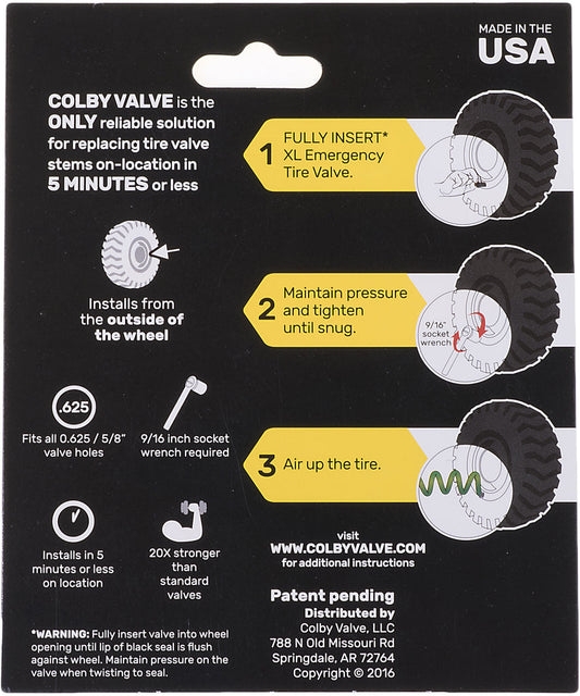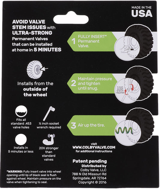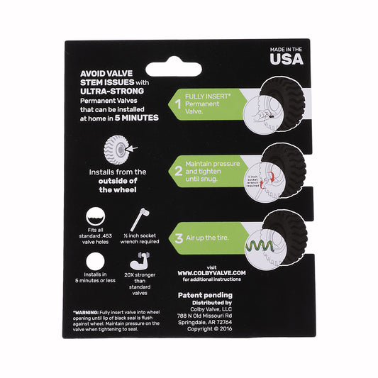Our first and still #1 tire valve, the Colby Valve Emergency Tire Valves are designed to be installed outside the tire in under 5 minutes. NO TOOLS REQUIRED! The unique design allows them to be installed on the go and tightened by hand. Fits standard .453 inch valve openings.